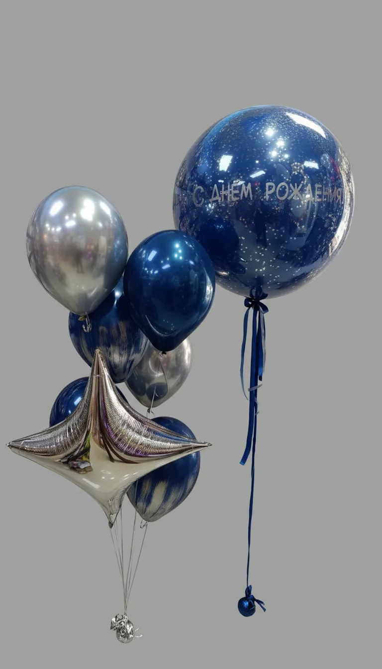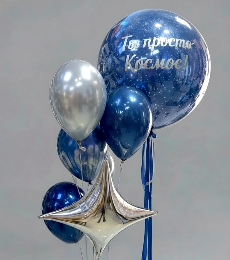 В составе: шар Бабблс 36"/91 см (внутри цветной шар и конфетти), надпись на шаре, 4 шара Дабл Стафф (шар в шаре) 14"/35см, 2 латексных шара с дизайном 14"/35см, 1 фольгированная четырехконечная звезда 31"/79 см. Шарики доставляются в транспортировочном пакете и на грузиках.