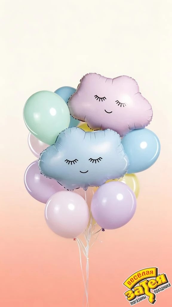 В набор входит: 2 фольгированные фигуры в виде Облаков 25" (65 см) и 11 латексных шаров 14" (35 см) пастельных оттенков.