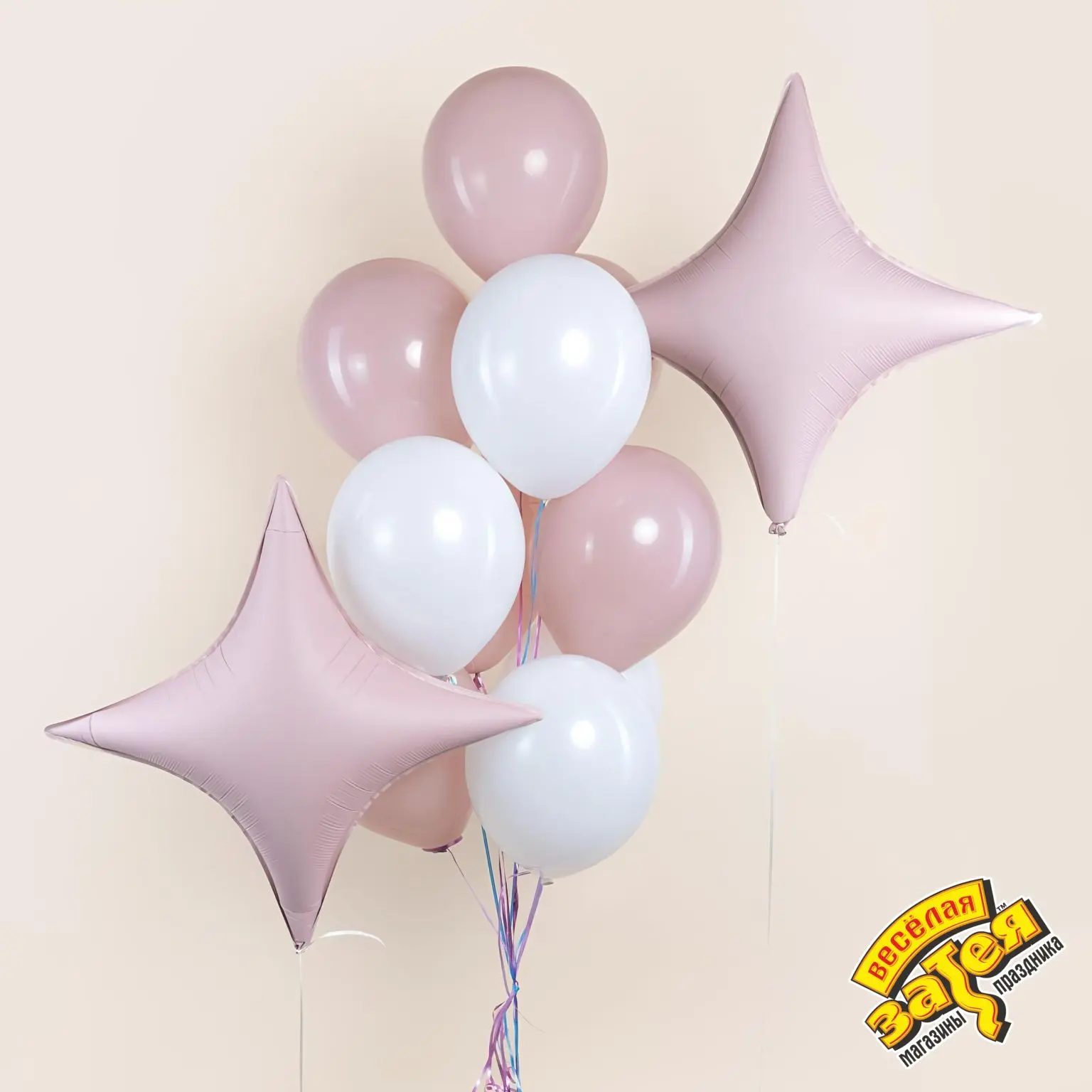 В набор входит: 2 розовые звезды четырехконечные 31"/79 см, 6 латексных шаров Хром 14"/35 см, 4 латексных шара 14"/35 см.