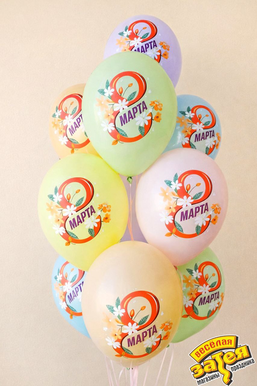 Тематические латексные шары с рисунком к 8 марта. Шар найдут гелием и обработан средством для продления полета. Размер шара 14" (35 см).